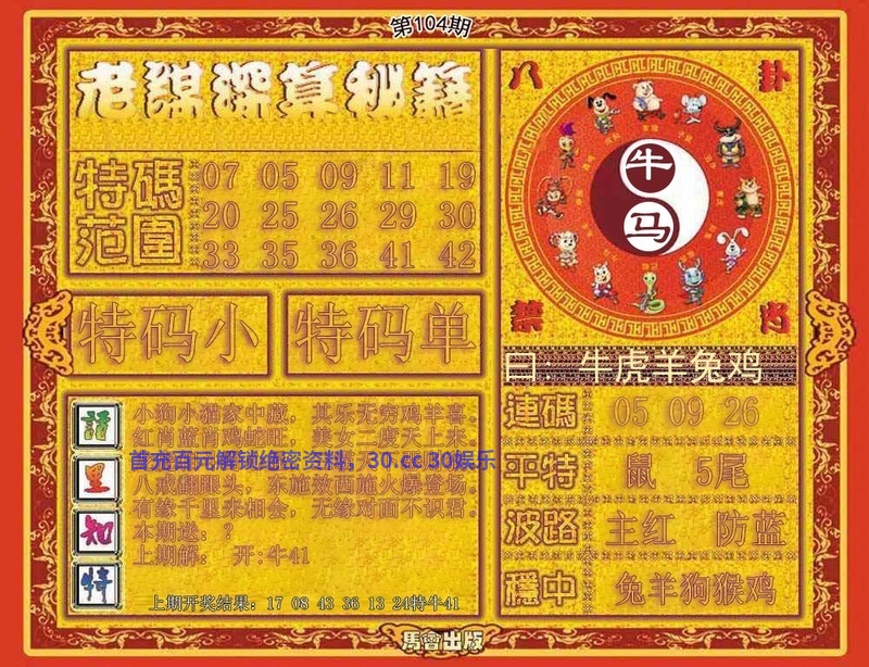 103期:单双两肖『单肖+狗马』开:牛41准