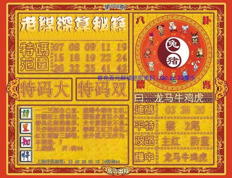 106期:单双两肖『单肖+狗龙』开:猪43准